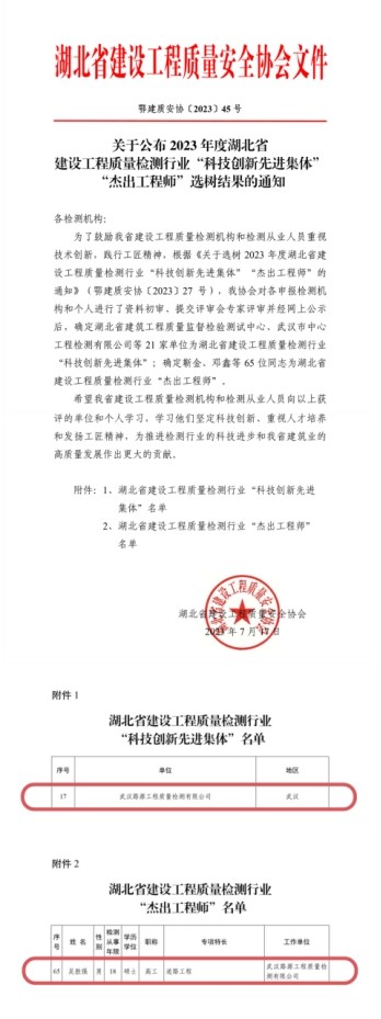 祝賀!市政設計院所屬路源公司及員工榮獲2023年度湖北省建設工程質量檢測行業“科技創新先進集體”、“杰出工程師” 稱號。