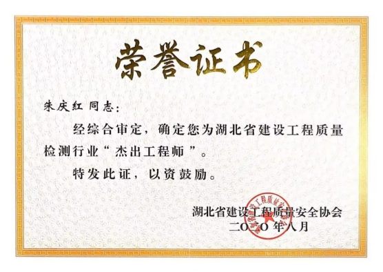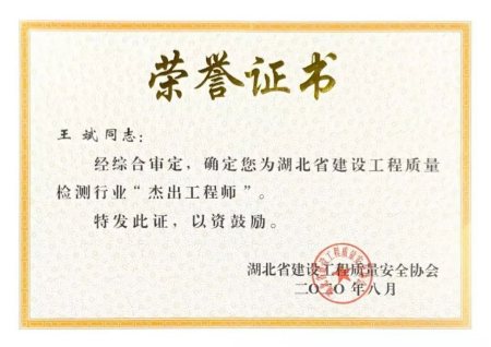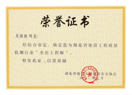 吳勝強扎根檢測工作18年,擁有過硬的技術本領和豐富的檢測經驗,累計檢測道路800多條,未發生一起質量安全事故。他作風頑強,善打硬仗,帶領技術團隊,高質量完成了軍運會重點保障線路、襄陽市環線提速改造項目、全國濕地公約第十四屆締約方大會重點參觀線路等項目的檢測工作,獲得了業主方的高度評價。