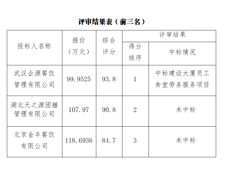? ? 經評審,綜合評分排名第一為武漢企源餐飲管理有限公司,報價為99.9525萬元/年,綜合評分為93.8分,中標武漢市政工程設計研究院有限責任公司建設大廈員工食堂勞務服務項目。