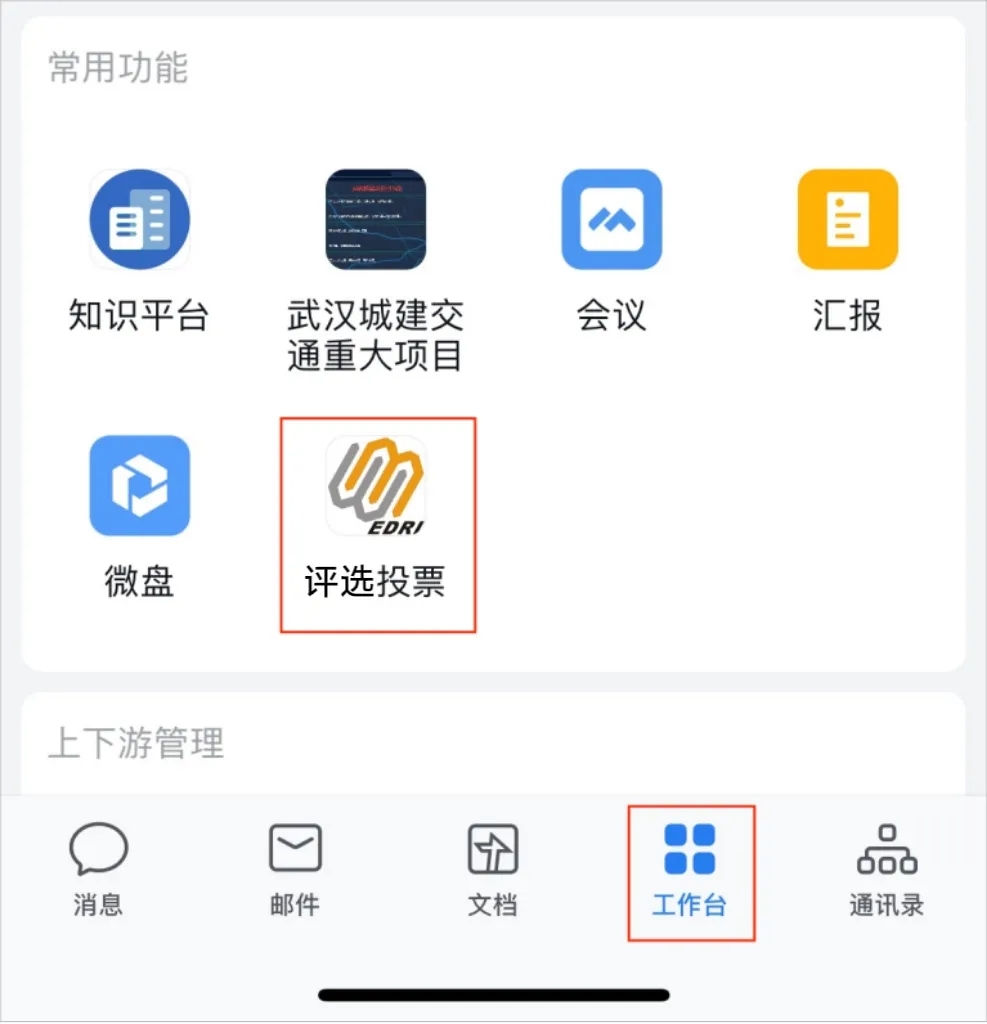 手機端企業(yè)微信進入工作臺,在常用功能一欄中打開“評選投票”小程序。