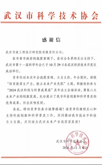 ? ? 在年會上,武漢市政院展示了近年來在科技創新和科學普及方面取得的成果,贏得了武漢市科協的高度贊譽,特此發來感謝信,對雙方在科技領域的攜手合作予以充分肯定,并期待未來繼續并肩前行,共同書寫科技進步與城市發展的新篇章。