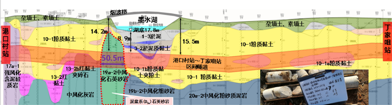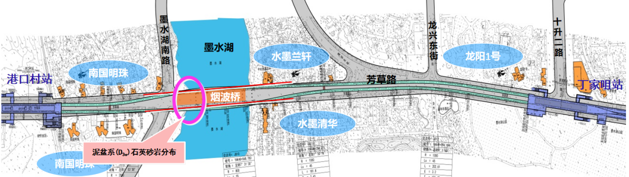 ? ? 超硬巖層、超近下穿。本項目設計范圍中的港口村站~丁家咀站區間隧道長約1242m,采用盾構法施工,管片直徑6.2m,需下穿墨水湖與煙波橋,該巖層號稱“磨刀石”,為武漢地鐵建設史上的最硬巖層。