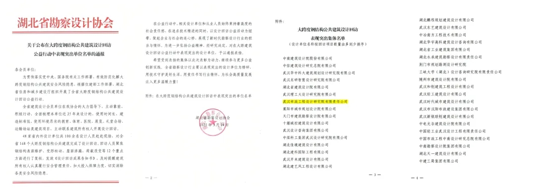 近日,湖北省勘察設計協會發布《關于公布在大跨度鋼結構公共建筑設計回訪公益行動中表現突出單位名單的通報》,武漢市政院憑借高度的社會責任感與卓越的專業貢獻,榮列通報表揚名單,成為全省勘察設計行業的標桿典范。