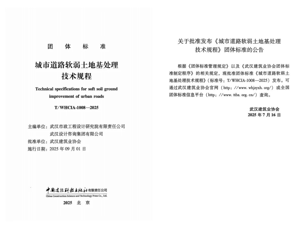 武漢市政院與武漢設計咨詢集團聯合主編的團體標準《城市道路軟弱土地基處理技術規程》,已由武漢建筑業協會批準發布。該規程是國內首部專門針對城市道路軟弱土地基處理的技術標準,有效解決了現行建筑與公路規范在市政道路工程中存在的諸多不明確、不統一的應用問題。其內容系統全面,兼具實用性與先進性,既體現了市政行業特色,又契合城市道路實際建設需求,對湖北省內城市道路軟弱土地基處理的設計、施工、關鍵技術方法及檢測監測等方面提供了權威依據與科學指導。該《規程》整體達到國內先進水平,在行業與省內居于領先地位。它的發布進一步鞏固了武漢市政院在市政巖土工程領域的技術優勢,顯著提升了公司的行業影響力與核心競爭力。