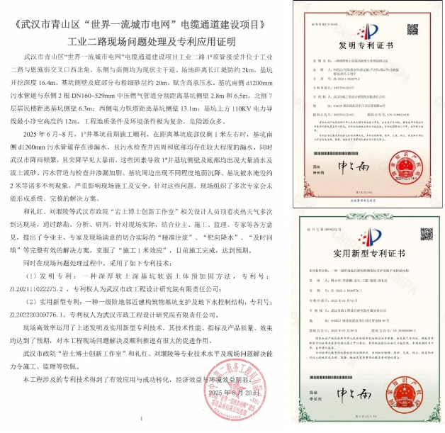 發明專利“一種深厚軟土深基坑軟弱土體預加固方法”(專利號:ZL202111022273.2)與實用新型專利“一種一級階地鄰近建構筑物基坑支護及地下水控制結構”(專利號:ZL202220309776.1),在武漢市青山區“世界一流城市電網”電纜通道建設項目——工業二路現場問題處理中實現了高效應用。兩項專利的技術性能、實施效果及產品質量均達到預期目標,成功完成了技術轉化,展現出良好的經濟效益與環境效益。