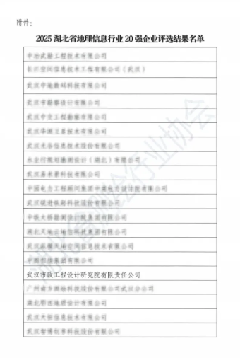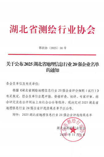 近日,從湖北省測繪行業協會傳來喜訊,武漢市政院憑借卓越的技術實力與行業貢獻,成功獲評“2025湖北省地理信息行業20強”。這一榮譽標志著公司在測繪地理信息領域的專業能力獲得省級權威認可,為企業發展里程碑再添濃墨重彩。