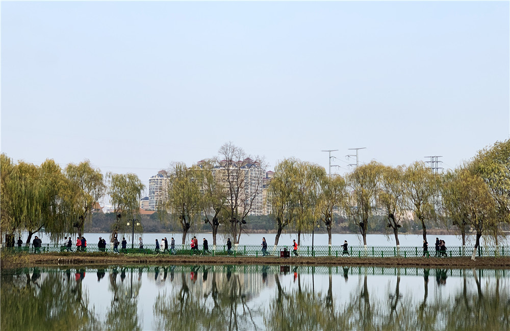 徒步比賽從金銀湖濕地公園廣場(chǎng)出發(fā),沿金銀湖步道到環(huán)湖路出口折返,全程6公里。當(dāng)天,胸前帶著比賽標(biāo)識(shí)的比賽選手一路蜿蜒前行,精神抖擻地在金銀湖濕地公園行走。