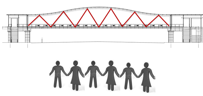 天橋采用充滿(mǎn)韻律感的變截面鋼桁架結(jié)構(gòu),形成多個(gè)人字形桁架梁,象征著全國(guó)人民手挽手肩并肩,精誠(chéng)團(tuán)結(jié)共同戰(zhàn)勝新冠病毒。