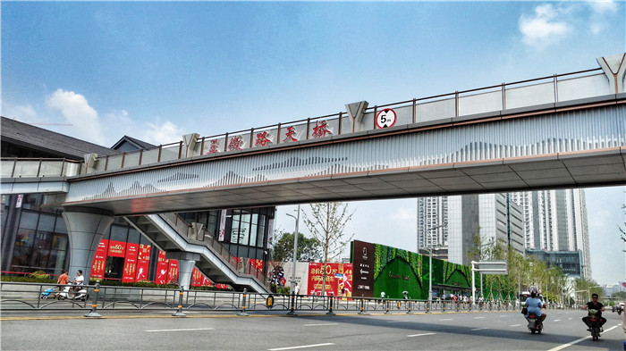 銀灰色和淡藍(lán)色相間勾勒流暢優(yōu)美的桁架拱橋曲線線條,將建筑美學(xué)和結(jié)構(gòu)美學(xué)有機(jī)結(jié)合在一起,色彩清新典雅,連續(xù)人字形鋼桁架顯示橋梁結(jié)構(gòu)的力量美。