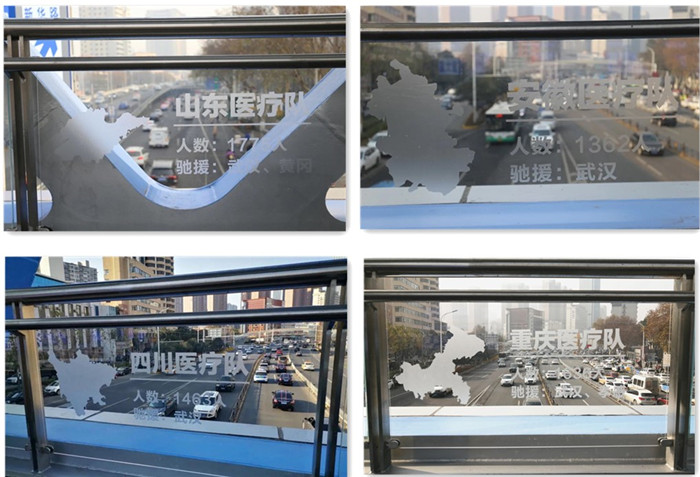 在天橋欄板上鐫刻著馳援湖北的人民解放軍醫(yī)療隊(duì)和30個(gè)省市自治區(qū)醫(yī)療隊(duì)的名稱(chēng)、人數(shù)、所屬地區(qū)地圖板塊以及支援疫情地區(qū)。時(shí)值湖北武漢抗疫的關(guān)鍵時(shí)刻,全國(guó)各地的白衣戰(zhàn)士逆行而上,馳援湖北,為控制疫情、保護(hù)人民的生命安全做出了巨大的貢獻(xiàn),他們的救城之恩銘刻在每一個(gè)湖北人、武漢人的心中。