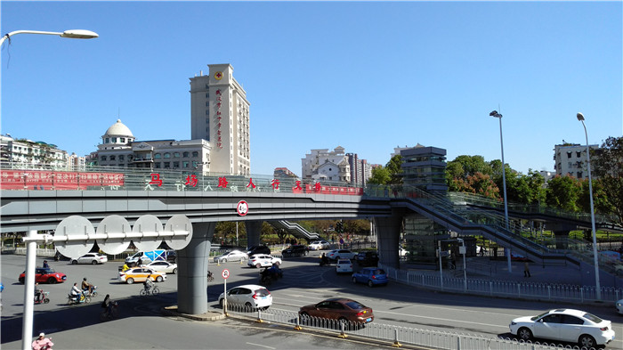 “同濟(jì)健康天橋”,被市民親切的稱(chēng)為“英雄橋”。主橋橫跨交通繁忙的解放大道,北接同濟(jì)醫(yī)院門(mén)診主樓,南連同濟(jì)醫(yī)院生殖中心。天橋主梁全長(zhǎng)55.2米,天橋兩端共設(shè)計(jì)4個(gè)出入口,安裝4部自動(dòng)扶梯,并設(shè)置了1:2的梯道。從空中俯瞰,呈現(xiàn)一個(gè)“工”字。