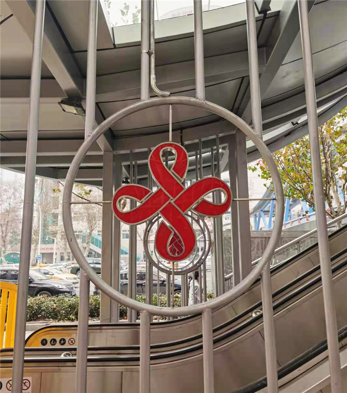 在天橋梯道及自動(dòng)扶梯入口處、橋下休憩區(qū)設(shè)計(jì)醒目的紅色標(biāo)識(shí),將中國(guó)結(jié)與紅十字融為一體,象征博愛(ài)、奉獻(xiàn)精神的白衣天使與武漢人民永結(jié)同心,中國(guó)結(jié)寓意著美好、吉祥、安康。