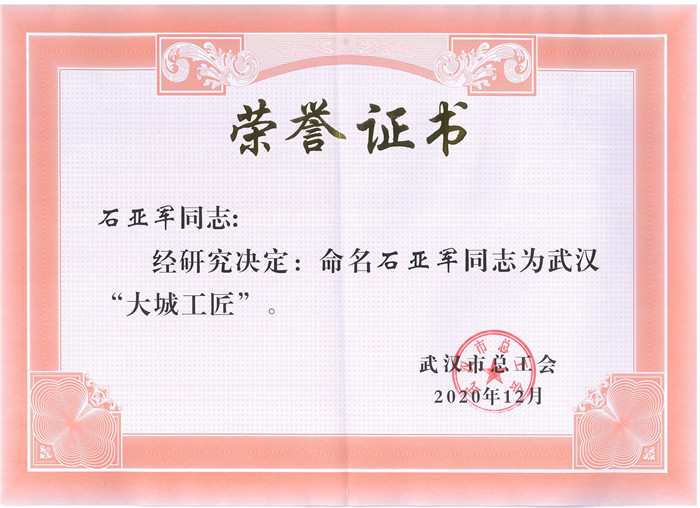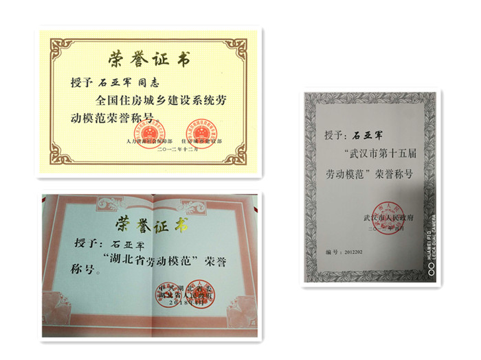 石亞軍同志先后榮獲“住房城鄉建設系統勞動模范”“湖北省勞動模范”“武漢市勞動模范”、武漢市“雙創”競賽活動“創新能手”、武漢市職工職業道德建設“雙十佳”先進個人等榮譽稱號,并于2018年作為“新時代、新氣象、新作為”武漢市勞動模范先進事跡報告團成員在武漢市作巡回報告,這是對他甘于奉獻、愛崗敬業、守正創新精神的褒獎!