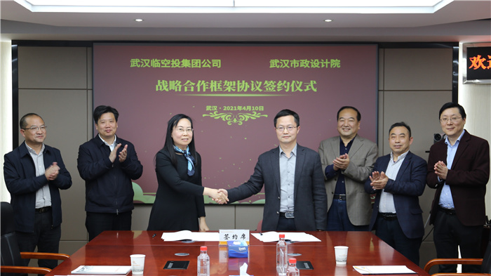 2021年4月10日,武漢市政設計院與武漢臨空經濟區建設投資開發集團有限公司在漢簽署戰略合作協議,雙方將依托各自的技術、資源等優勢,在臨空經濟區內的市政項目整體策劃研究、環境治理等方面開展深度合作。武漢市政設計院董事長武興治、總經理姚華、紀委書記談逢陽、副總經理陳建斌,武漢臨空投集團公司黨委書記、總經理黃峰,副總經理朱年正,副總工程師王瑩,以及雙方相關人員出席簽約儀式。