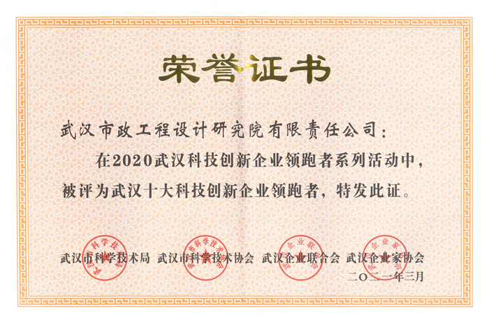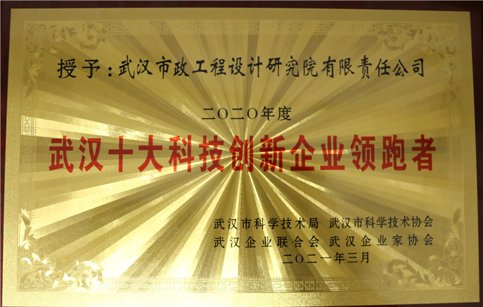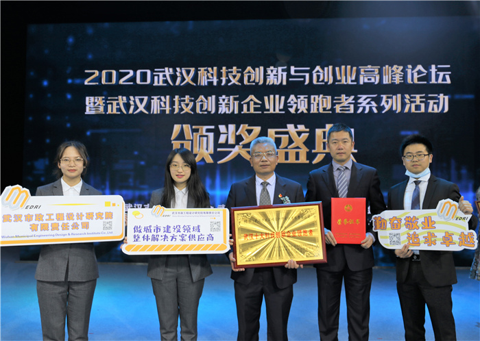 2021年4月15日,武漢創新與創業高峰論壇暨武漢科技創新企業領跑者系列活動頒獎盛典在武漢電視臺演播廳隆重舉行,武漢市政設計院榮膺“2020年度武漢十大科技創新企業領跑者”稱號,公司副總經理周俊作為嘉賓上臺領獎。