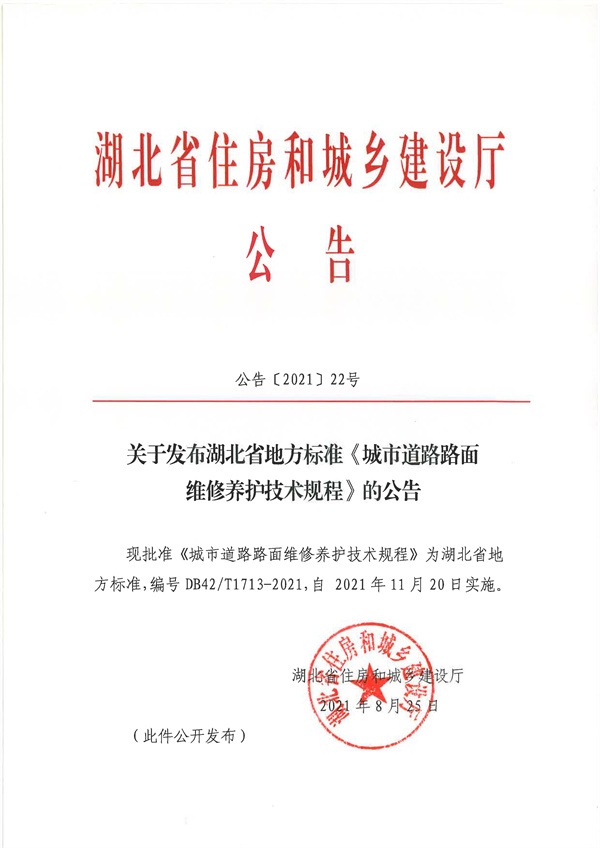 由我公司牽頭起草的湖北省地方標準《城市道路路面維修養護技術規程》(編號:DB42/T 1713-2021)于2021年7月20日由湖北省住房和城鄉建設廳、湖北省市場監督管理局聯合發布,并于2021年11月20日起實施。