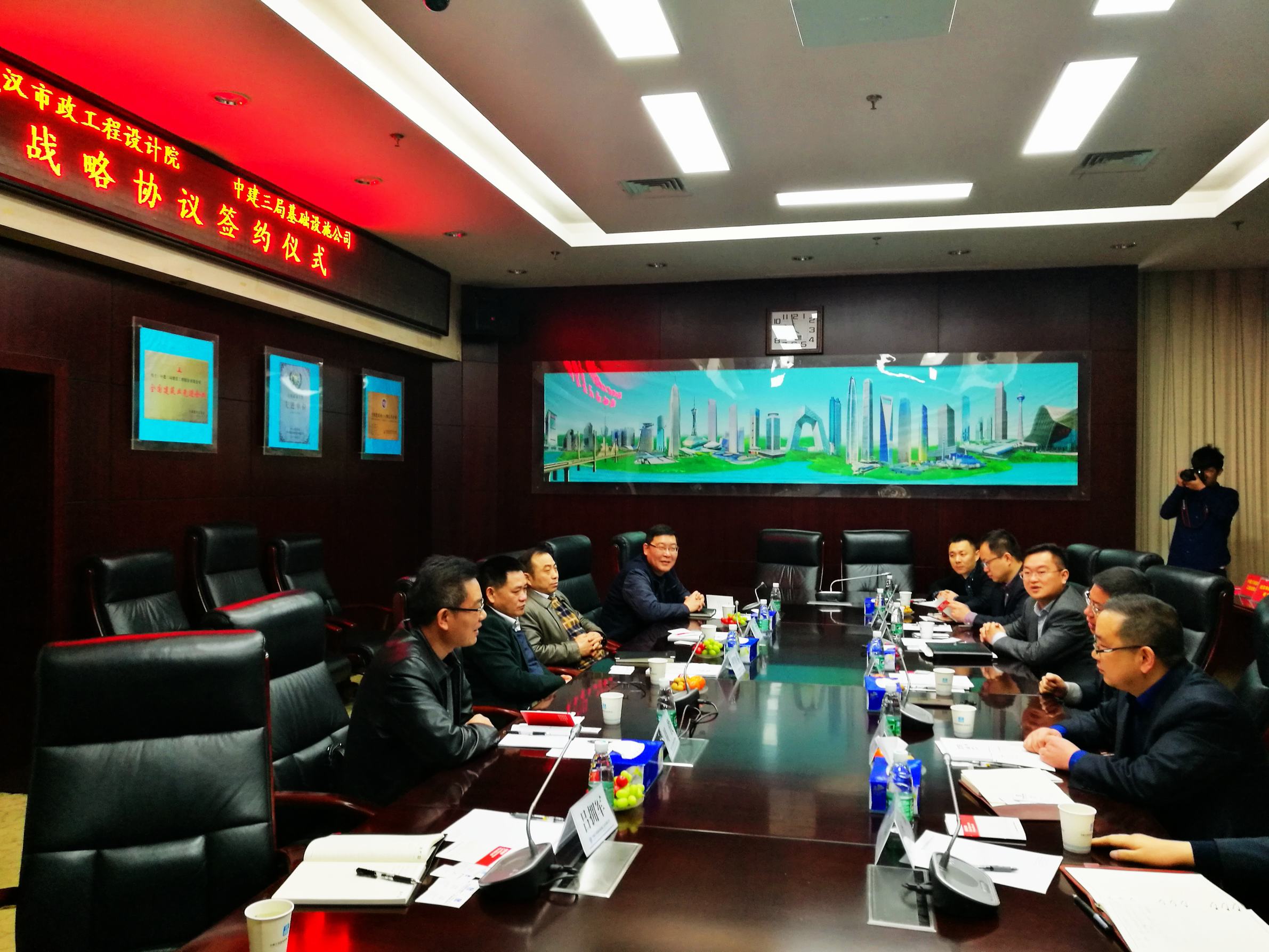 ??? 協議簽訂前,雙方進行了簡短的會談,公司董事長柯昌春和中建三局基礎設施工程有限公司董事長王洪濤就雙方各自的基本情況進行了介紹,就雙方戰略合作方向和前景進行了展望。雙方共同表示,期待以本次戰略合作協議簽訂為契機,推動雙方在更廣泛的領域進行合作,攜手進行市場開拓,實現互利共贏。