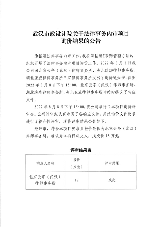 武漢市政設(shè)計(jì)院關(guān)于法律事務(wù)內(nèi)審項(xiàng)目詢(xún)價(jià)結(jié)果的公告